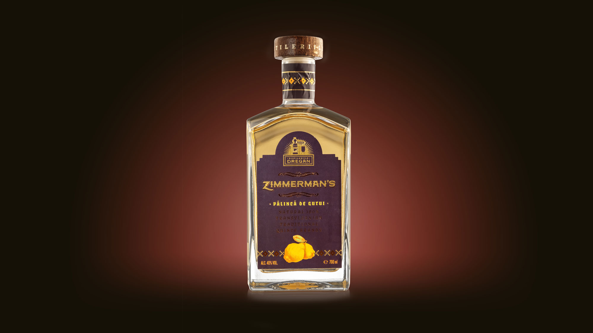 Dall’altro, una classica testa legno piatta – misure 45x18mm – verniciata noce, con doppia personalizzazione in hot stamp oro, gambo sintetico 20mm, è stata invece dedicata alla palinca di mele cotogne Zimmerman’s.