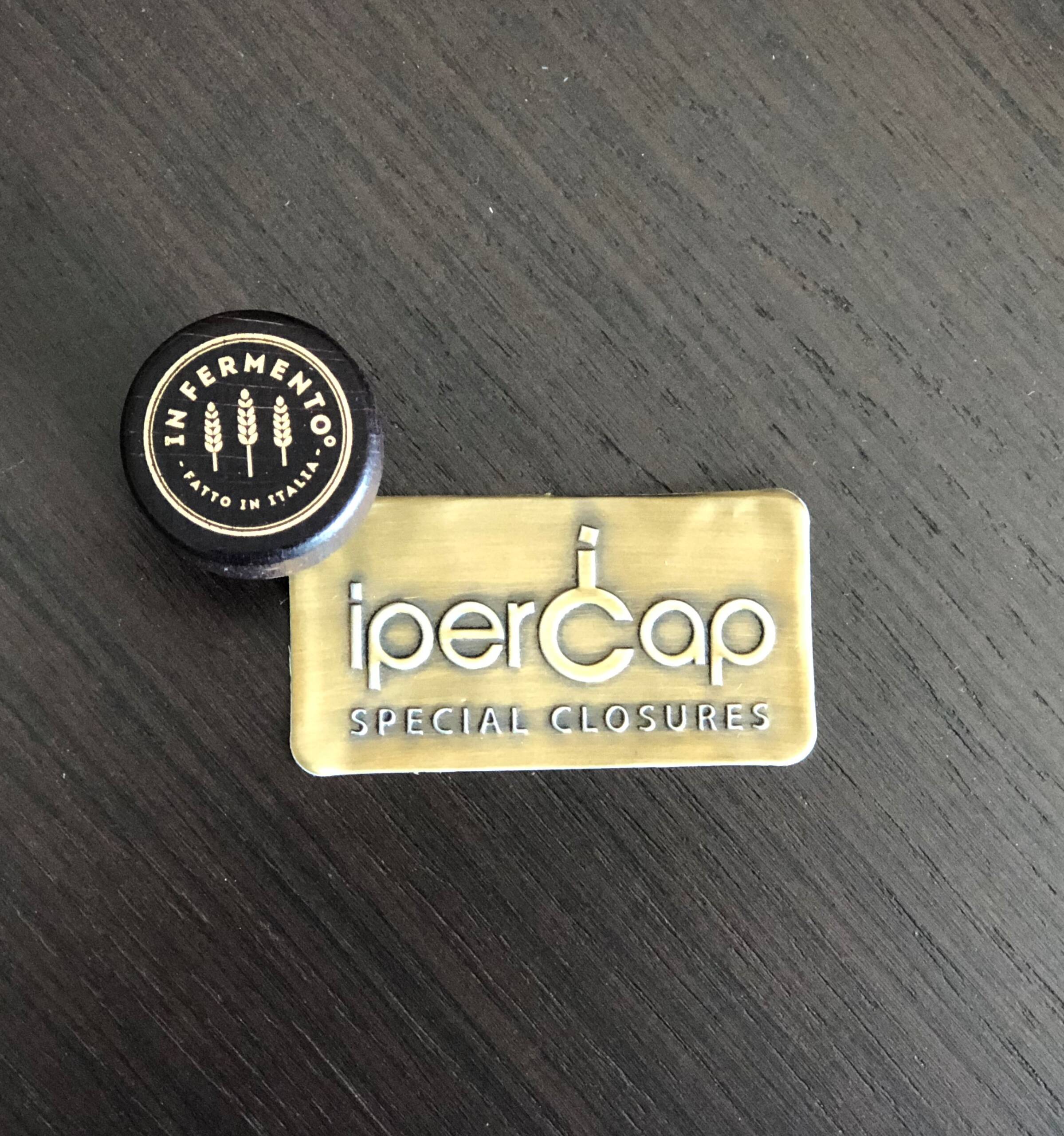 - Tappo personalizzato con logo “In Fermento – Fatto in Italia” stampato in oro lucido a hot stamp